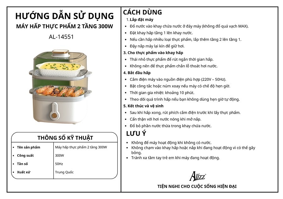 Nồi hấp bánh đa năng 2 tầng Alizz AL-14551 không chỉ giúp bạn tiết kiệm thời gian mà còn giữ trọn dinh dưỡng trong từng món ăn. Với thiết kế nhỏ gọn, dễ sử dụng và tính năng tự động ngắt an toàn, đây là lựa chọn lý tưởng cho gia đình, nhân viên văn phòng hay sinh viên muốn có bữa ăn nhanh, lành mạnh. Đặt mua ngay hôm nay để nâng tầm bữa ăn hằng ngày và tận hưởng sự tiện lợi trong căn bếp của bạn!